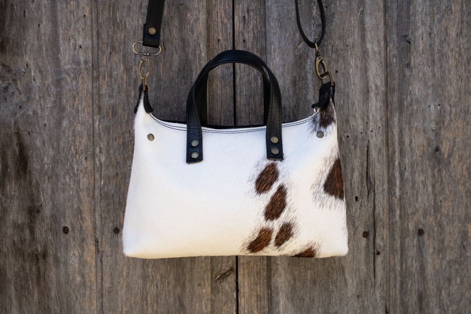bolso mediano elaborado con suave piel de vacuno con pelo y estampado de vaca blanco y marrón