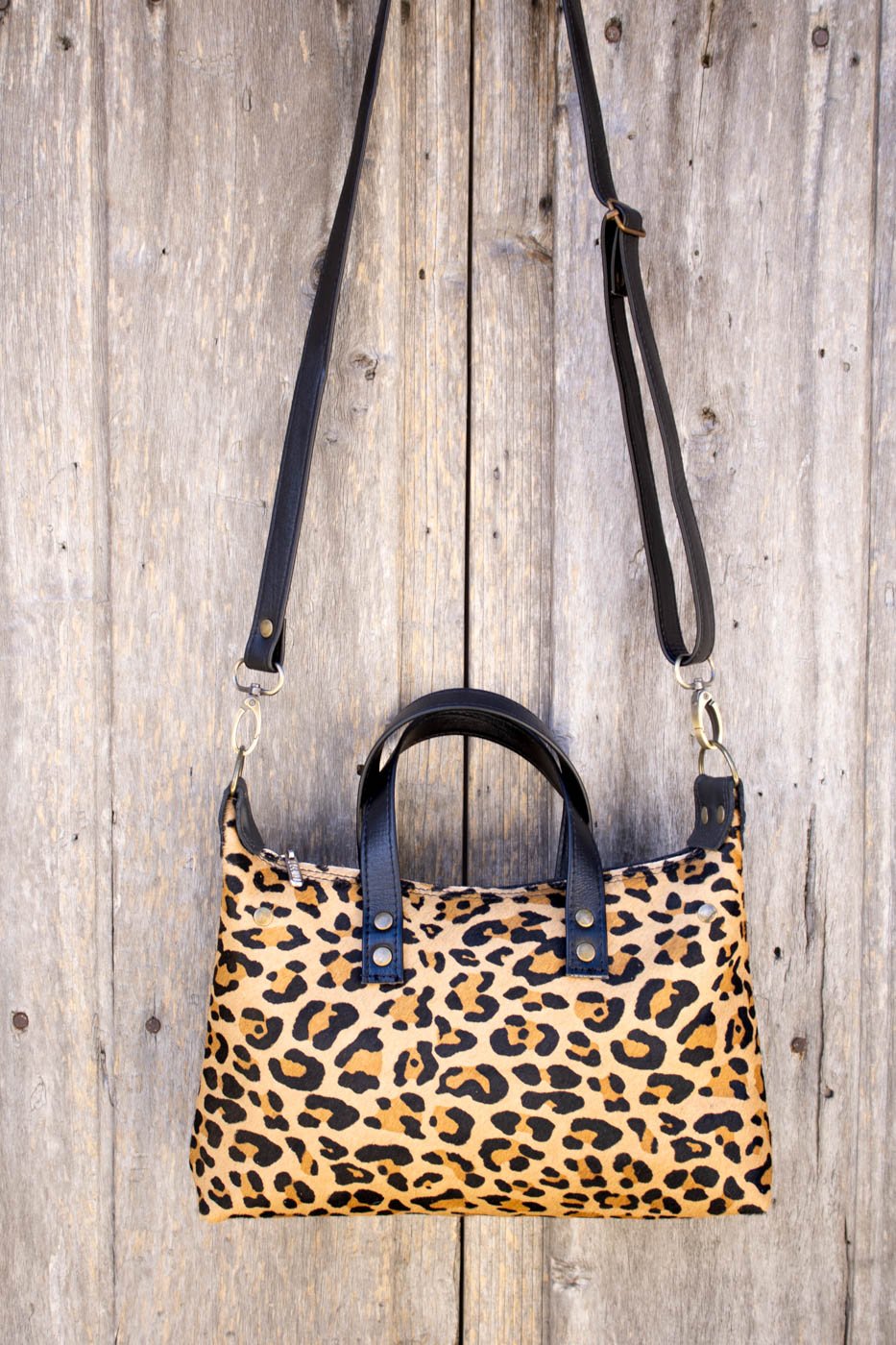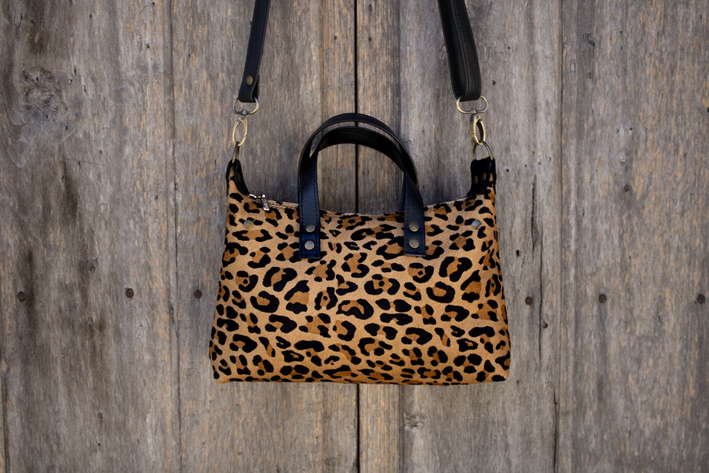 Bolso mediano de piel elaborado en un lateral con suave piel de vacuno con pelo y estampado de leopardo y en el otro lado vacuno negro